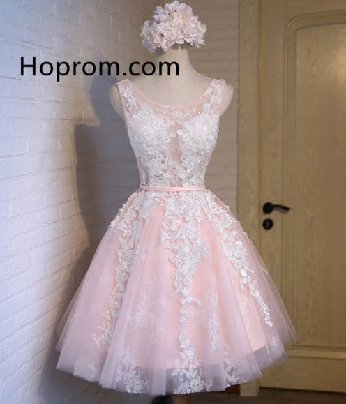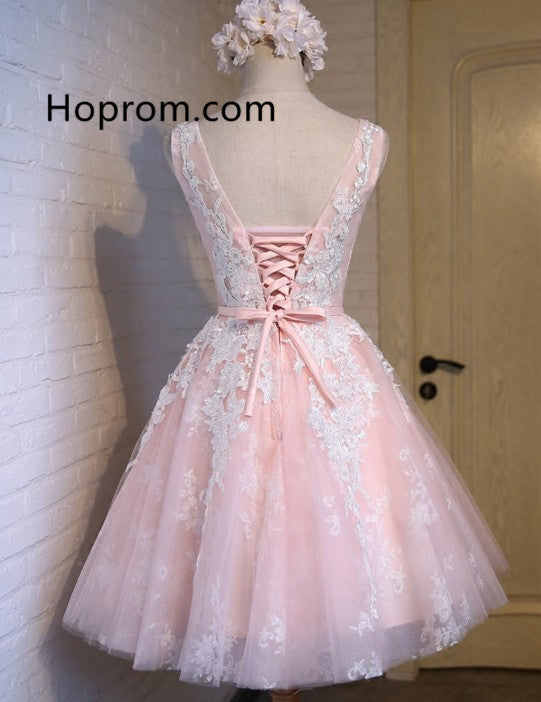 Pink A-line Appliques Tulle Homecoming Dresses, Lace Up Cute Dress