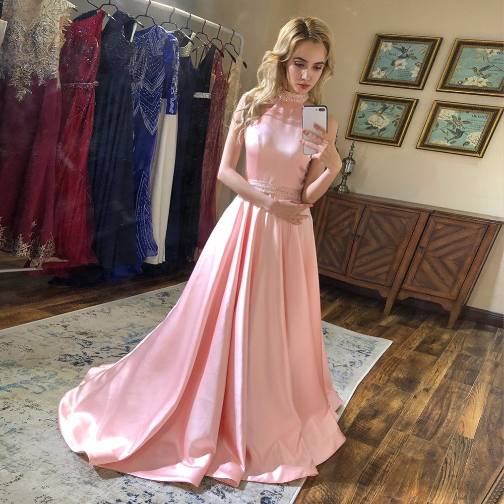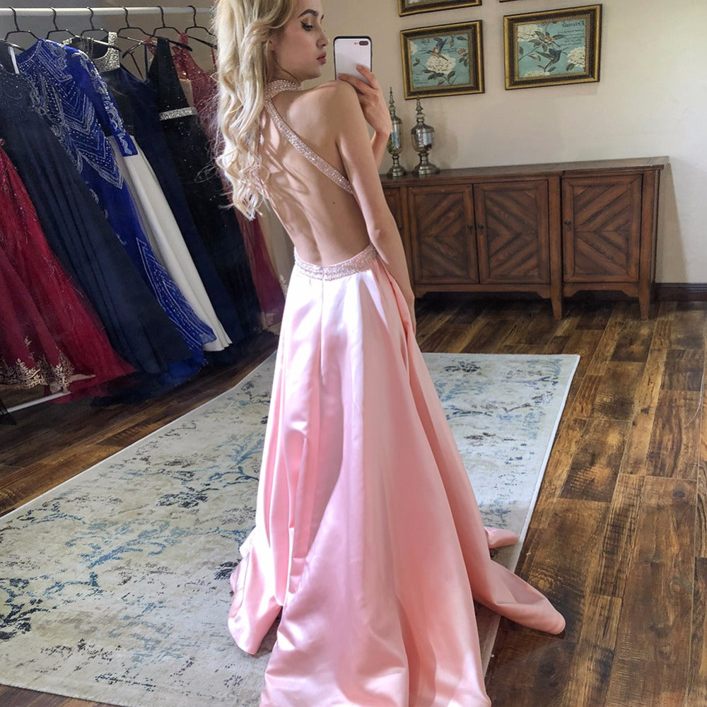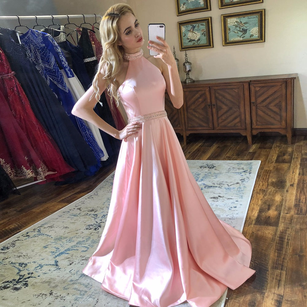 Blush Halter Long Prom Dresses Pink Beaded Halter Neck Satin Formal Evening Dress