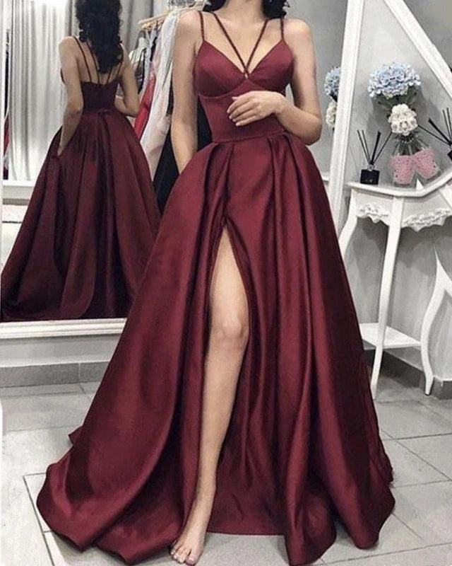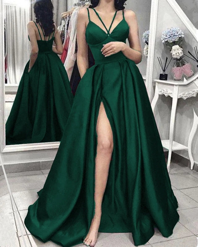 Sexy Spaghetti Straps Prom Dress High Slit Evening Dresses Red, Blue & Green 3 Colors