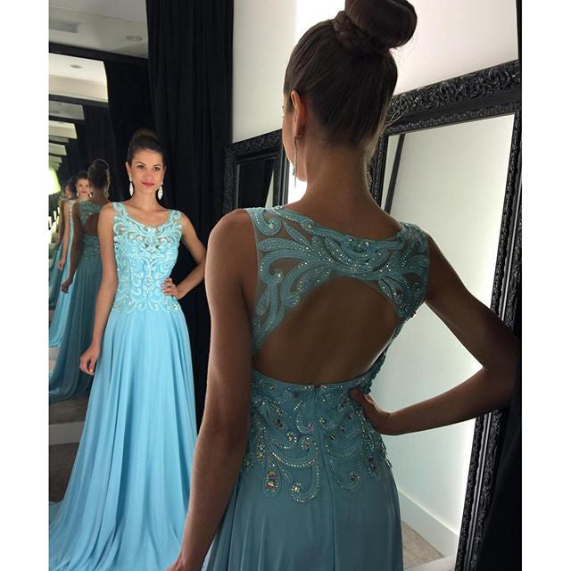 Sleeveless Prom Dresses,Backless Prom Dress,Blue Evening Dress